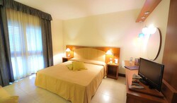 DESCRIZIONE E SERVIZI: Camere: Dispone di 220 camere tra doppie, triple, quadruple (queste ultime tutte con letto a castello; quadruple con 2 letti singoli bassi su richiesta e previa disponibilità) e camere quadruple adattate a quintupla con letto a castello e letto singolo, unico vano e unico bagno per 5 persone. Tutte le camere sono dotate di servizi con doccia con box, aria condizionata, telefono, Tv, wi-fi, mini-frigo, cassetta di sicurezza, asciugacapelli, terrazzo o patio con tavolino e 2 sedie. Disponibili camere standard lato piscina con supplemento. Le segnalazioni circa l’assegnazione della camera non sono garantite e dipendono dalla disponibilità dell’albergo; cambio camera a pagamento € 25 a camera. Disponibili anche Villette, camere familiari doppio vano di 30mq, piano terra e immerse nel verde. Dotate di mini-frigo, aria condizionata e zanzariere, cassaforte, due camere da letto, una matrimoniale e una tripla (terzo letto a ponte), un bagno finestrato con ampio box doccia e asciugacapelli; spazioso patio esterno attrezzato. Ogni camera da letto è dotata di porta finestra indipendente e tv a schermo piatto. Disponibili su richiesta camere per disabili (max 2 persone) con sedia Job ed ombrelloni riservati in spiaggia.